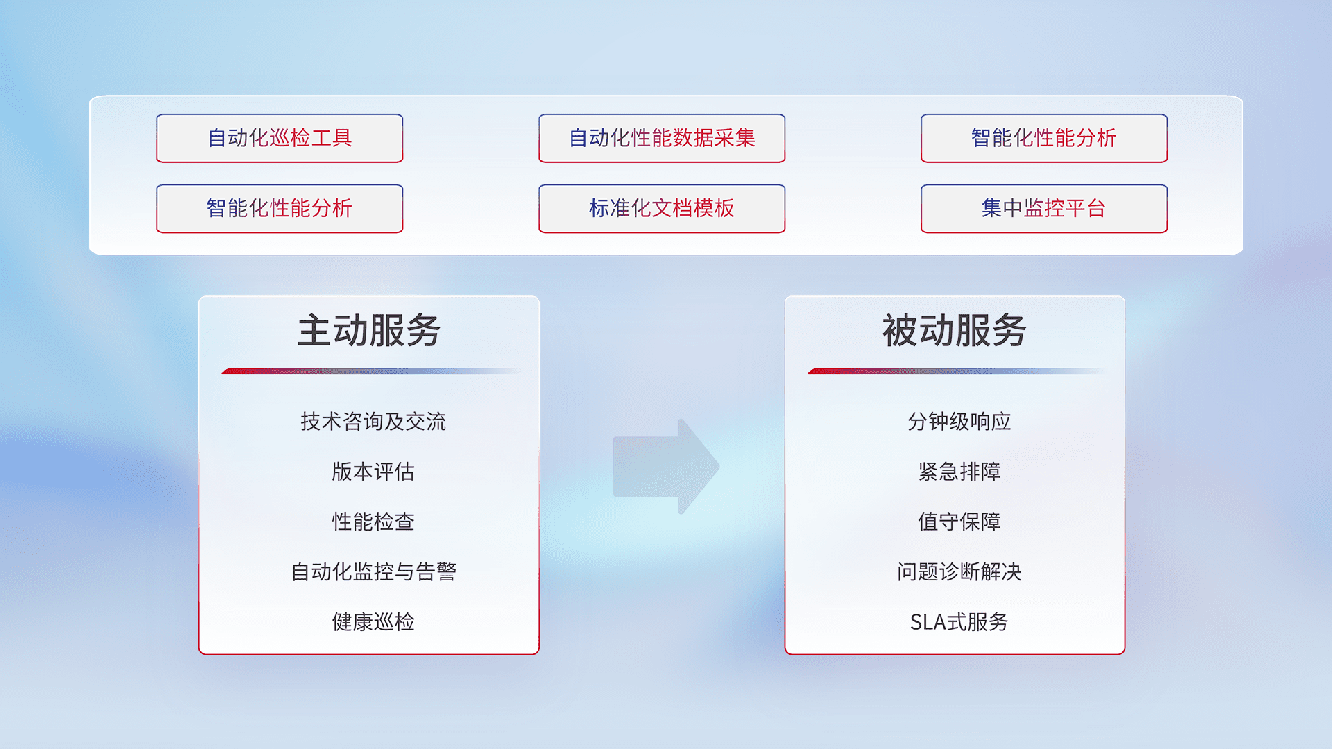 智能化工具和标准化文档,,,,保障服务质量,,,提供主动服务(包含技术咨询、、、版本评估、、性能检查、、、自动化监控与告警、、、、健康巡检)和被动服务包含(分钟级响应、、、、紧急排障、、、值守保障、、、问题诊断解决、、、SLA服务)。。